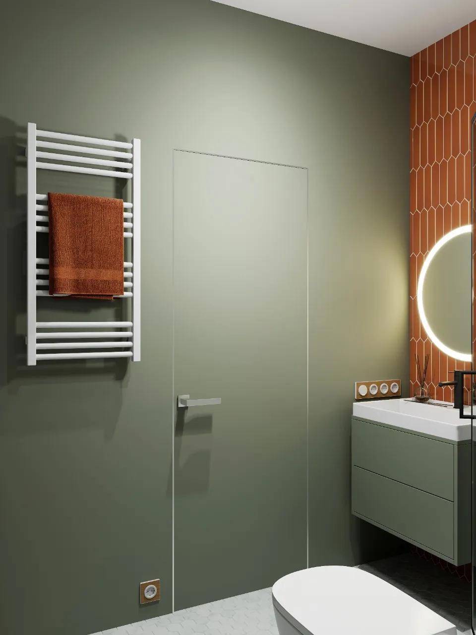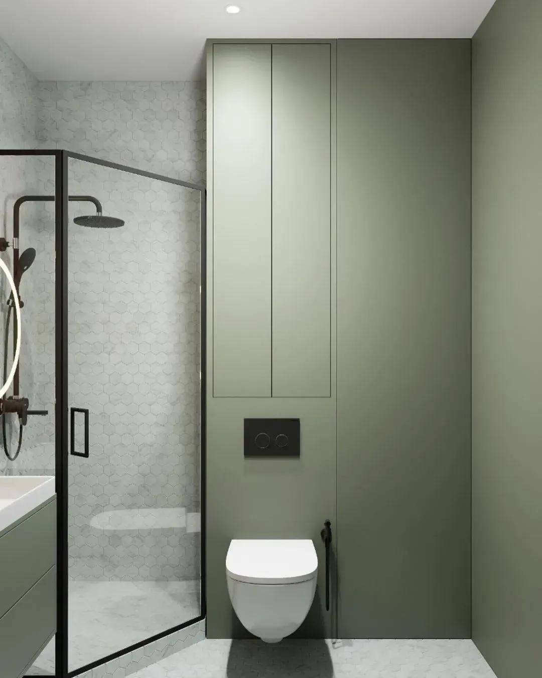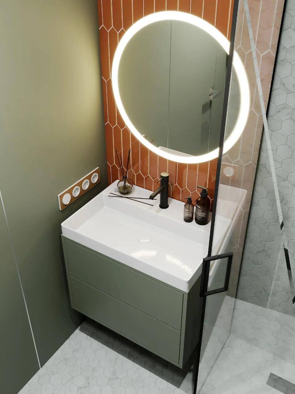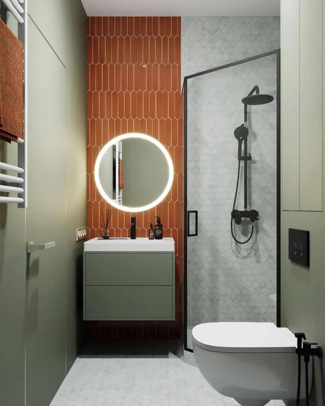 干湿分离卫生间,整体采用低饱和橄榄绿与暖调赤陶色撞色设计,兼顾了实用性与高级感。
