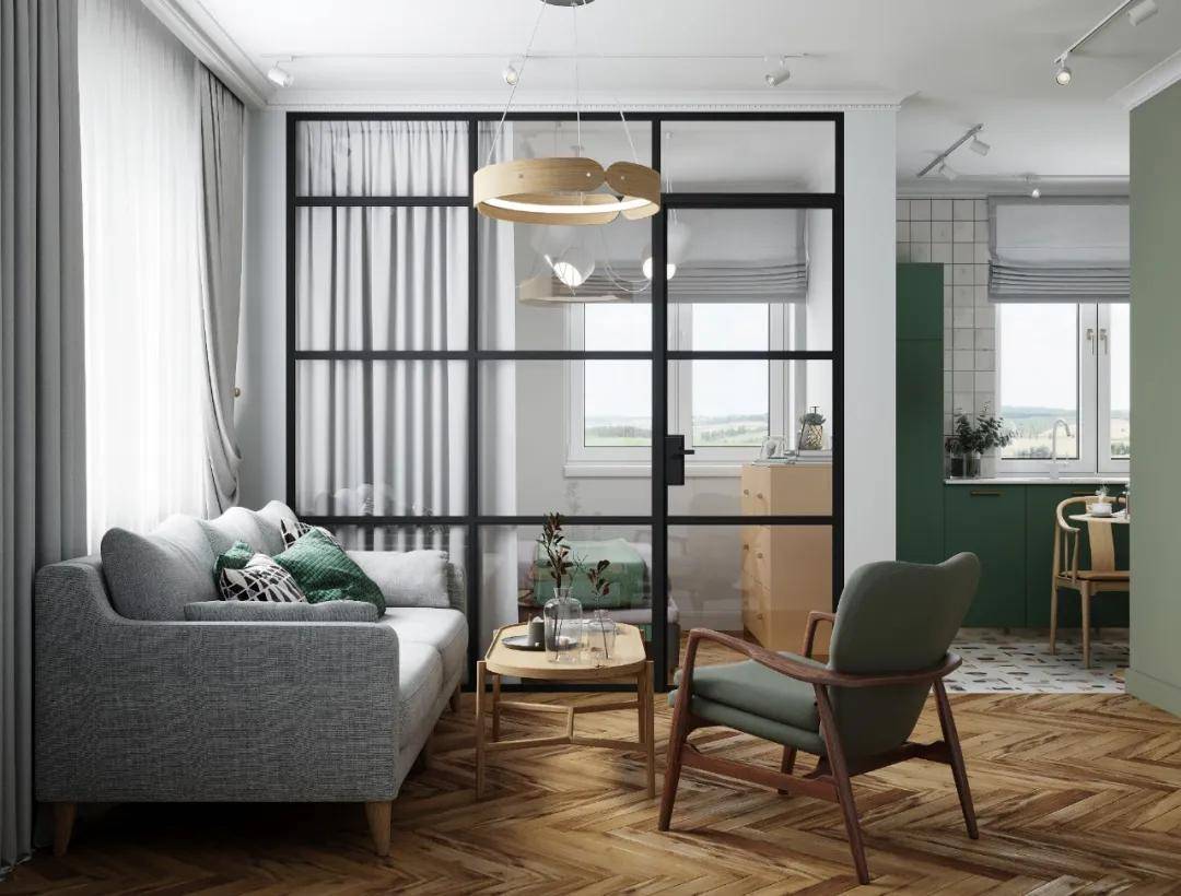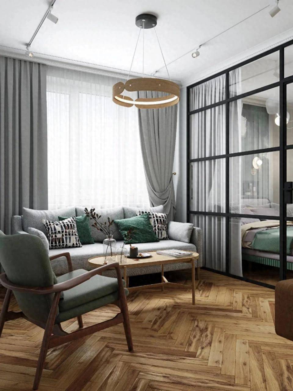 别看地方不大,生活里该有的东西一样不少,全都安排得妥妥当当。客厅和卧室用玻璃隔断分开,再拉上窗帘,就成了一个独立的小房间。客厅虽然不大,但布置得精致又舒服,软软的沙发占了一角,旁边还配了个小巧的边几。