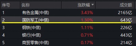 关税扰动再起,国防军工板块走出独立行情,行业涨幅在30个中信一级行业中高居第二,仅次于有色金属。