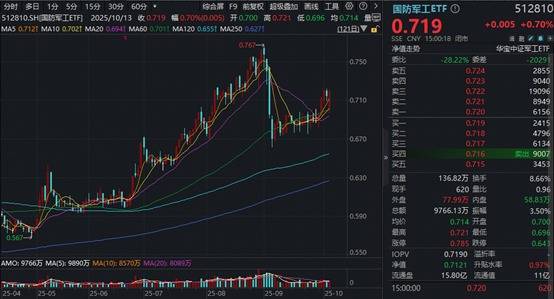 国防军工ETF(512810)全面表征该行业核心资产整体走势,盘中两度逆市翻红,尾盘再次发力,场内收涨0.7%,全天振幅3.5%,放量成交9766万元。值得关注的是,场内频现溢价,显示买盘势力较强,或有资金积极介入。