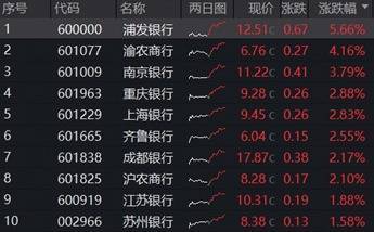 市场震荡加剧,银行板块再一次走出超额表现,彰显防御性。截至收盘,A股42只银行股大面积飘红,浦发银行领涨5.66%,渝农商行涨超4%,南京银行涨超3%,重庆银行、上海银行、齐鲁银行、成都银行、沪农商行涨超2%。