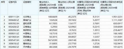 基本面上,根据2025年中报,中证有色金属指数60只成份股中,55股上半年实现盈利,占比超91%。从归母净利同比增速来看,10股实现翻倍,北方稀土净利暴增1951%居首,国城矿业归母净利亦暴增1111%。
