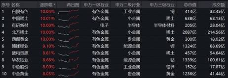 5只成份股强势涨停!细分方向来看,稀土龙头北方稀土、中国稀土涨停,盛和资源涨超8%;黄金龙头西部黄金涨停,中金黄金涨超8%;铜业龙头白银有色涨停,锂业龙头赣锋锂业涨超9%。