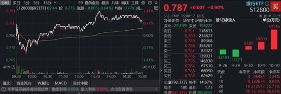 百亿顶流银行ETF(512800)早盘逆市走强,午后进一步冲高,场内价格一度涨1.4%,收涨0.9%,连收5日、10日两条均线,日线逆市3连阳,全天成交额21.87亿元,环比放量41%。