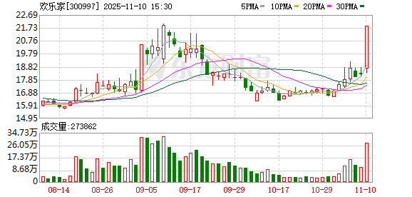 欢乐家今日涨停,全天换手率7.09%,成交额5.66亿元,振幅19.26%。龙虎榜数据显示,深股通净买入867.06万元,营业部席位合计净买入1.24亿元。